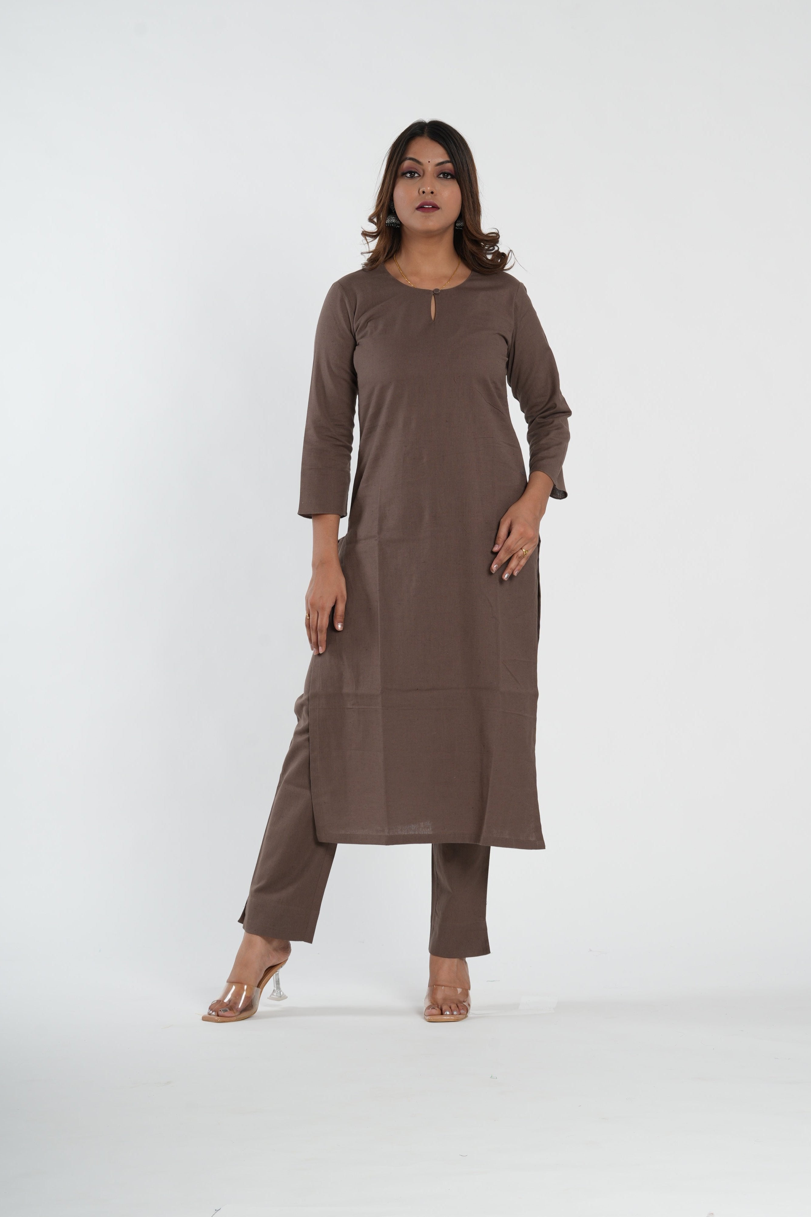 brown cotton flex kurta & pant features a straight-fit kurta with a round split neck line and three-quarter sleeves. Complemented with trousers with a partially elasticated waistband and roomy pockets, this style is perfect for casual outings.