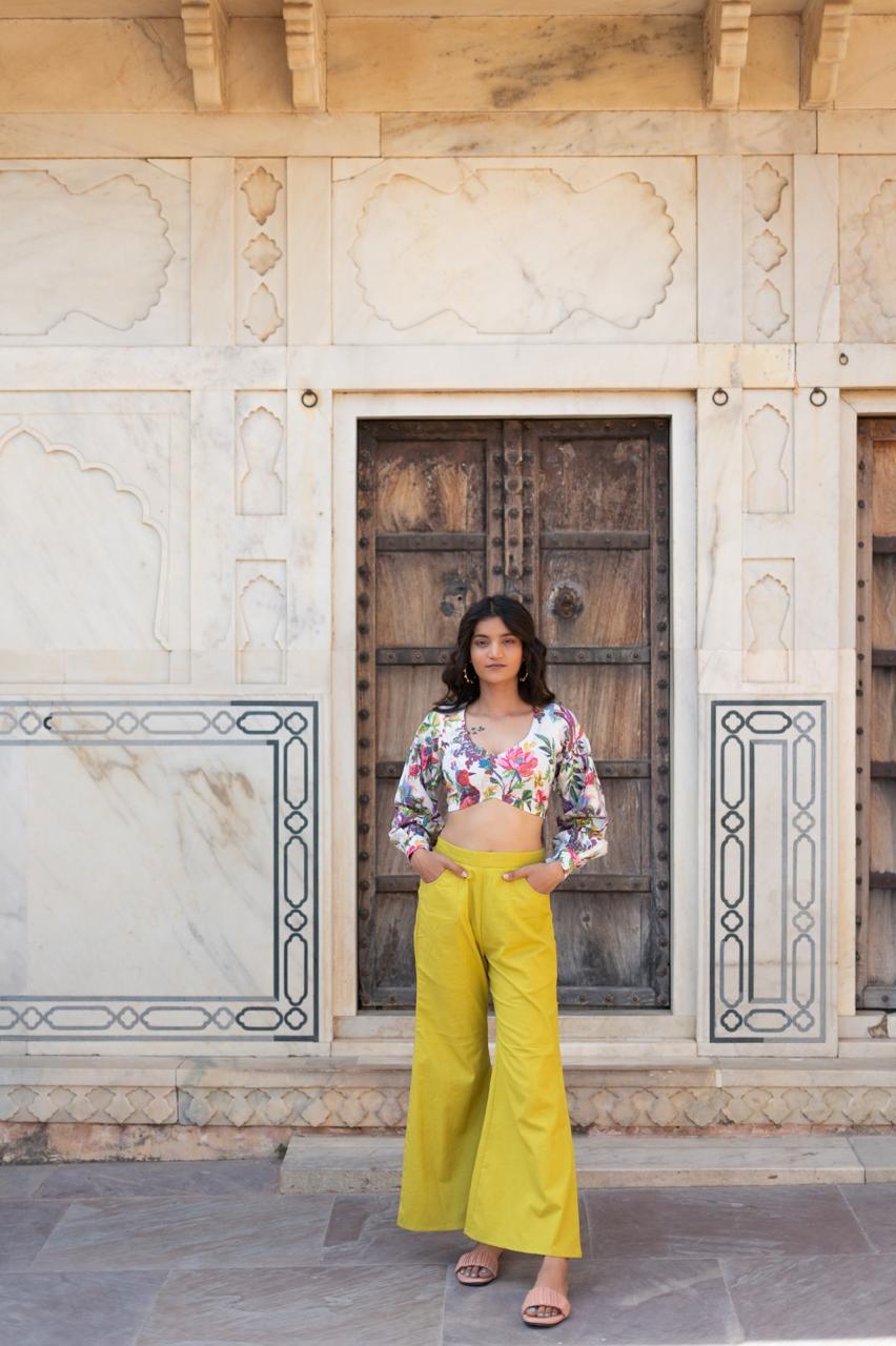 Our 2 piece white floral print cotton co-ord set features a crop top with a U-shape neckline, stylish gathers bell sleeves. Complemented contrasting with bell bottom pant with a partially elasticated waistband with side zip . This style is perfect for casual outings.