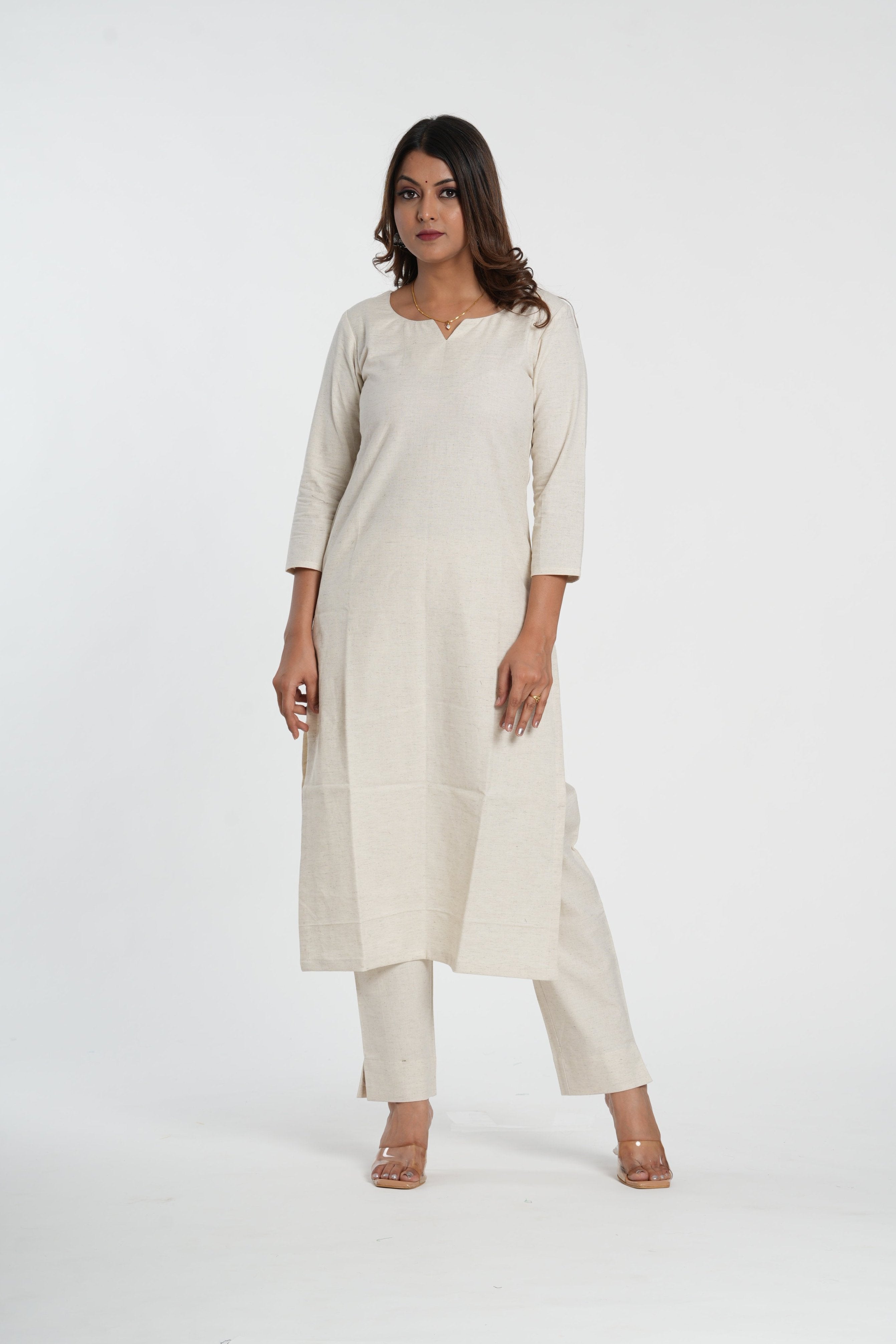 Our 2 piece brown/off white cotton flex kurta & pant features a straight-fit kurta with a round split neck line and three-quarter sleeves. Complemented withtrousers with a