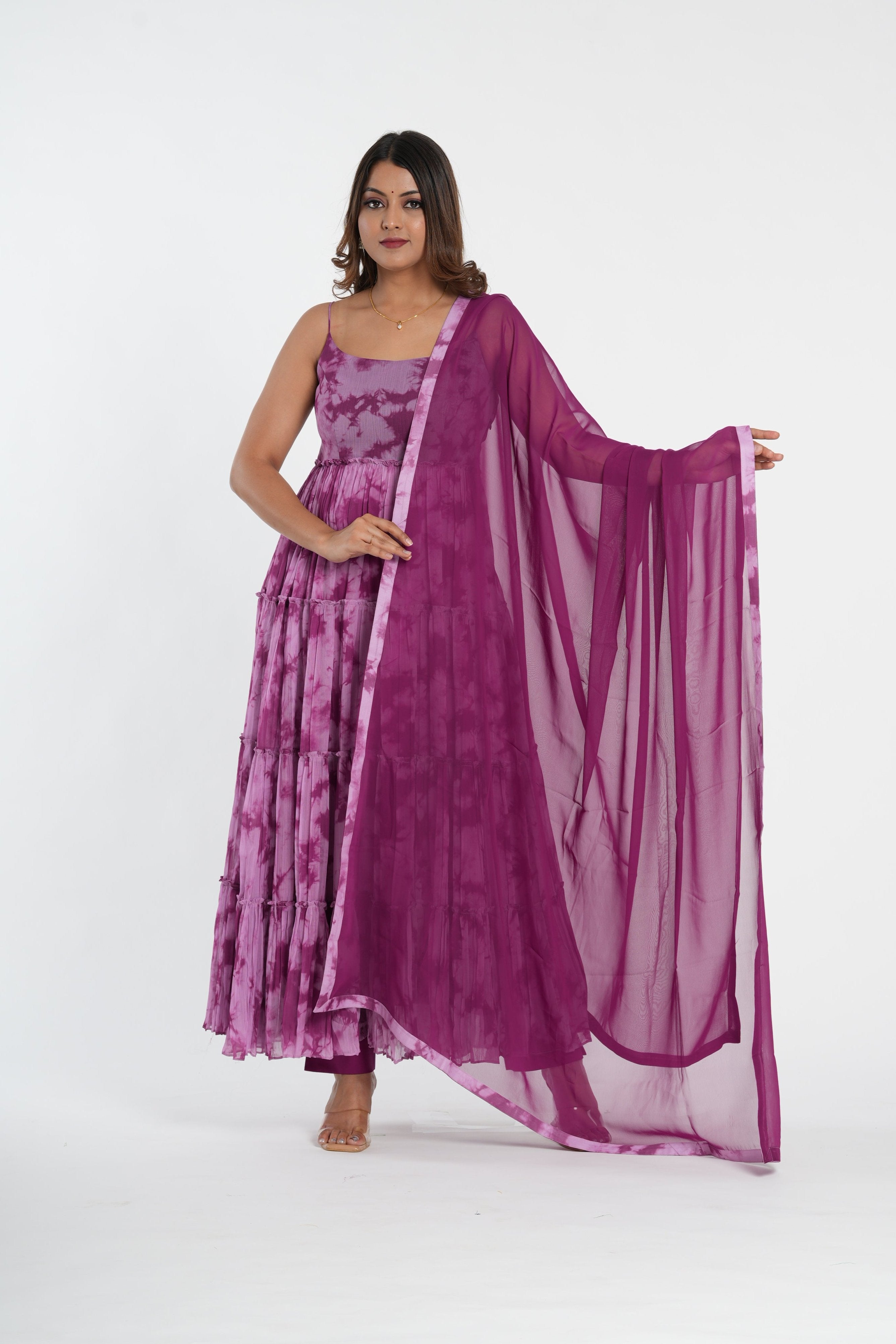 This Tye and dye printed chiffon anarkali suit is perfect for weddings or day occasions. It has intricate attractive vibes and comes with a Matching contrasting dupatta.