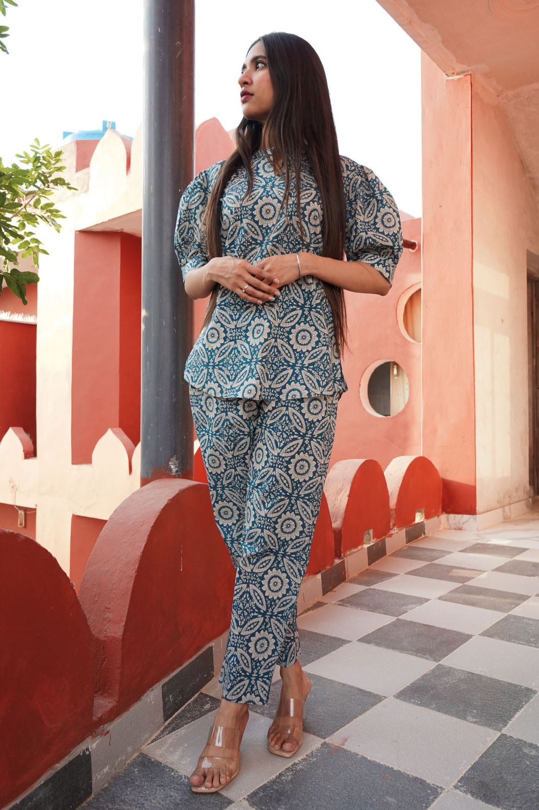 Introducing our newest creation: the cotton fusion cord set. This captivating ensemble boasts a harmonious blend of style and comfort. Adorned with a delightful print that runs throughout, it exudes charm and sophistication. The whimsical bubble sleeves add a touch of playfulness, while the tailored trousers ensure a polished finish. Versatile enough for any occasion,