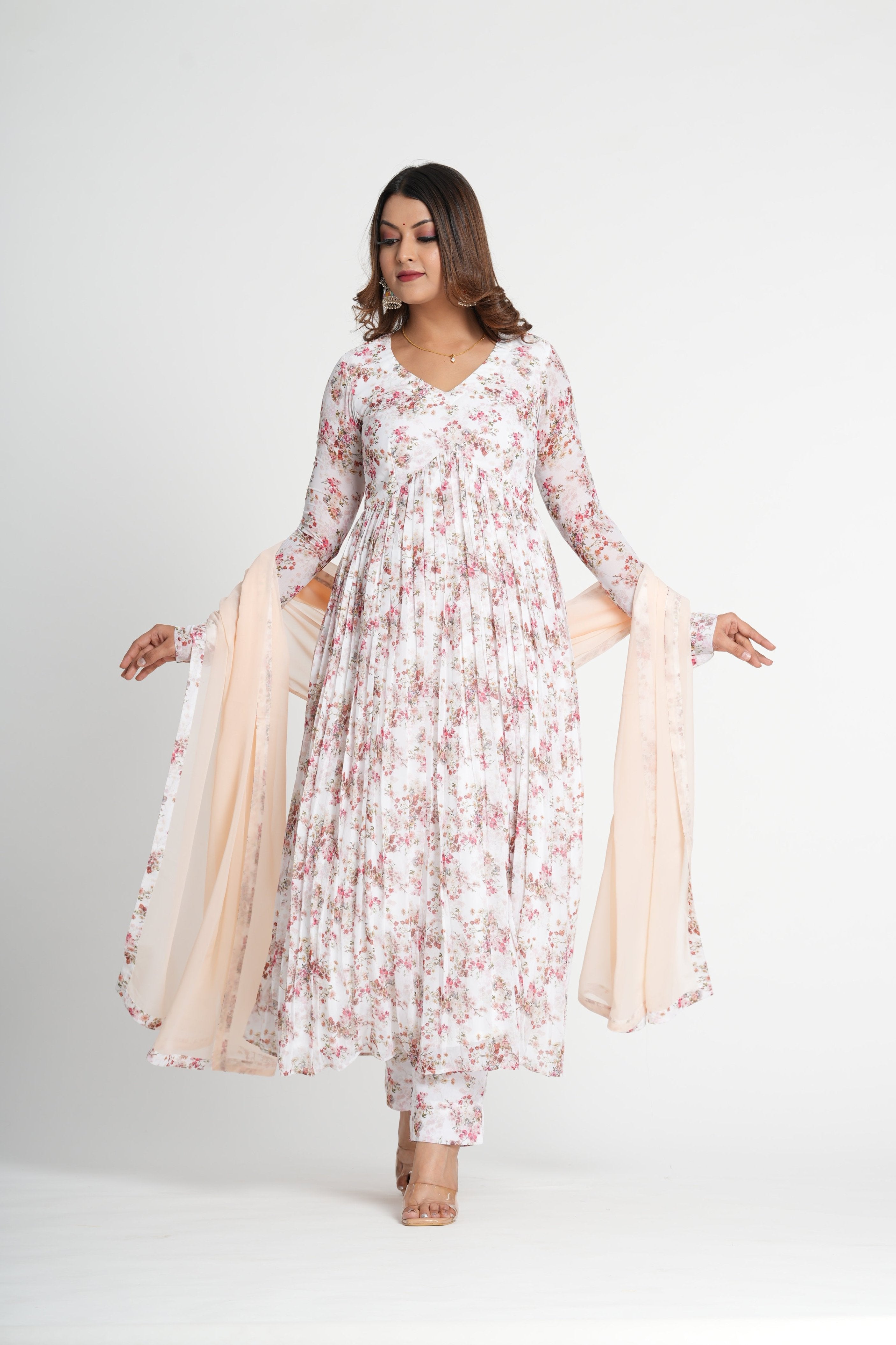 This Floral printed georgette anarkali suit is perfect for weddings or day