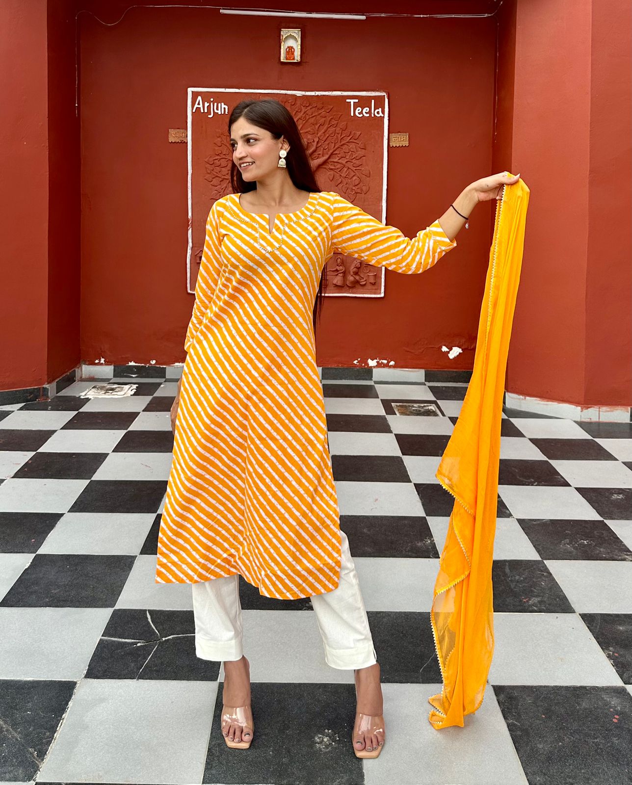Stylish Straight Cotton Yellow Leheriya Suit Set