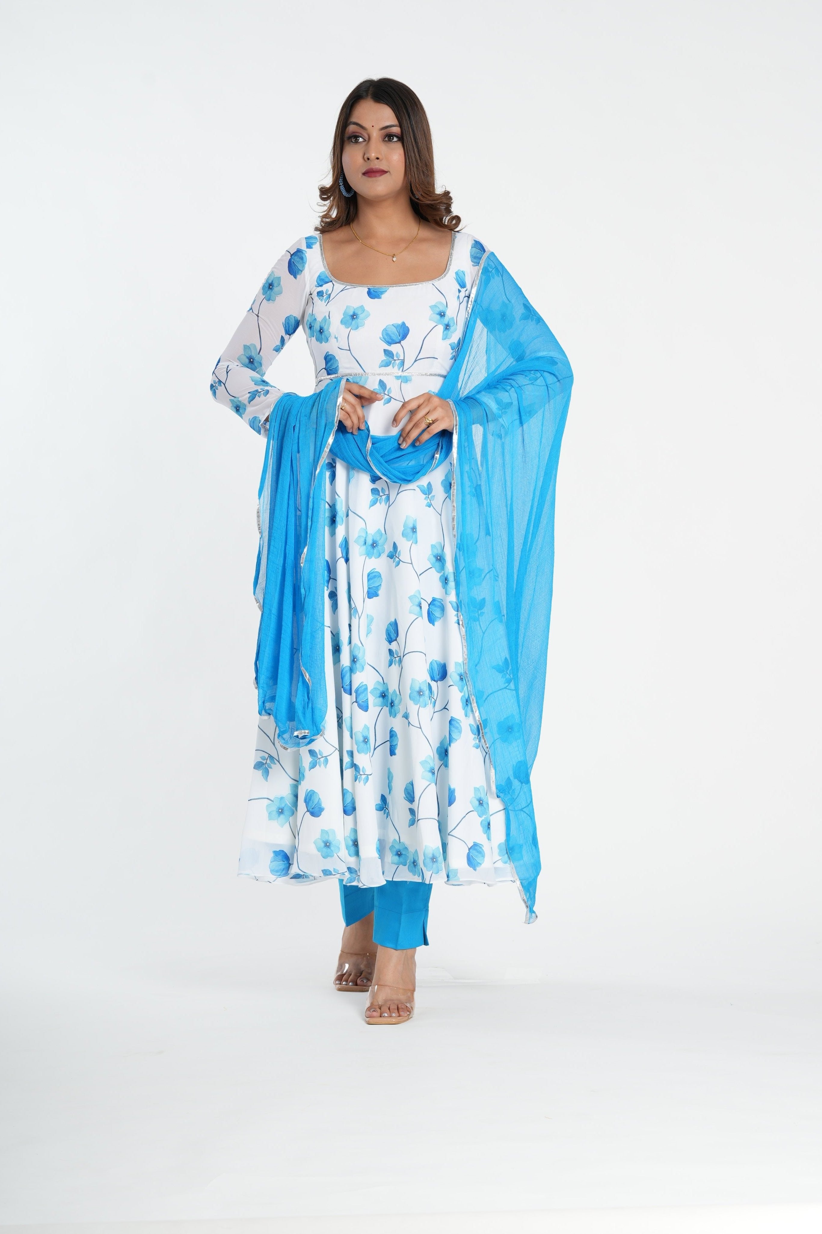 This Floral printed white blue georgette anarkali suit is perfect for weddings or day occasions. It has intricate attractive vibes and comes with a Matching contrasting dupatta. Model Size & Fit Comfort Fit